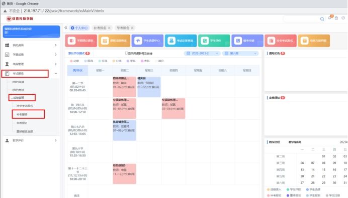 四、网上报名操作方式:登录学校官网http://kjxy.whsu.edu.cn/,点击“教务在线”→“教务管理系统入口”输入账号密码,点击左侧“考试报名-成绩管理-补考报名”菜单。