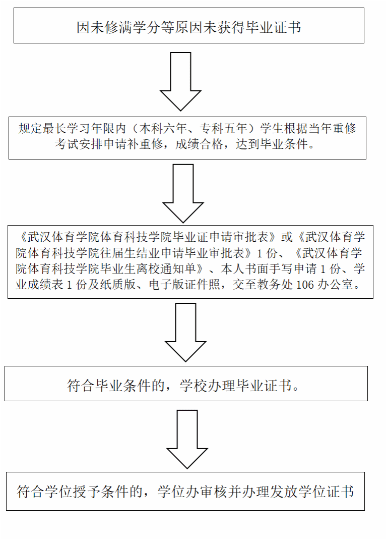 凡符合人才培养方案要求,并达到我校毕业、学位授予标准的往届生及在毕业年级入伍的学生,即日起至规定受理时间内将《武汉体育学院体育科技学院毕业证申请审核表》(附件1,供延期毕业学生填写)或《武汉体育学院体育科技学院往届生结业申请毕业审批表》(附件2,供结业学生填写)、《武汉体育学院体育科技学院毕业生离校通知单》(附件3)、《武汉体育学院体育科技学院往届毕业生学位申请审批表》(附件4)及其他证明材料交至教务处相关联系人(毕业资格审核联系人:肖老师;学位资格审核联系人:陈老师,电话:027-81300033),具体流程见下图,逾期未提交者,本批次将不再受理。学校将集中审批和制证,毕业证书中载明的毕业时间按实际发证日期填写;符合学位授予条件的,由学校学位办按规定办理。