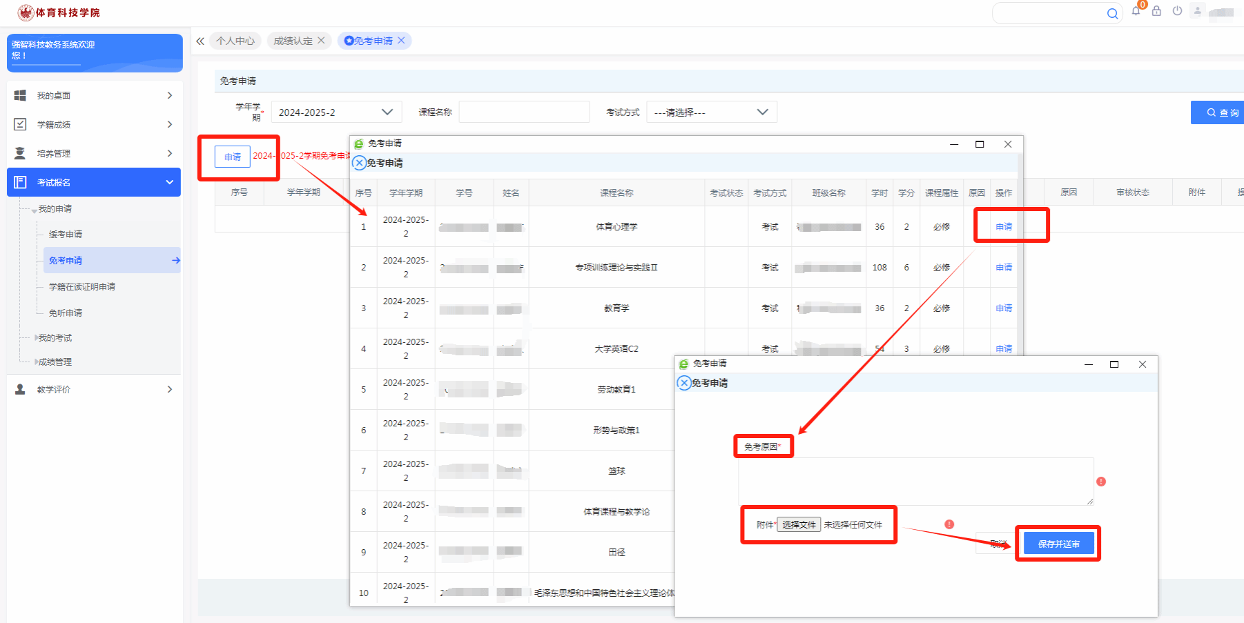 进入免考申请页面,申请→(点击需要选修的课程)→ 按照要求填写申请原因,拍照上传免考证明材料。例:奖励学分上传获奖证书和公示名单截图,退役复学学生上传退役证明,统一扫描成PDF格式上传。(注所有操作均需在电脑上完成)