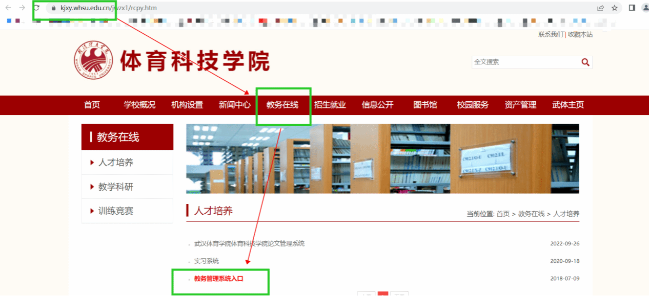1、访问武汉体育学院体育科技学院官网--进入教务在线--教务管理系统入口: