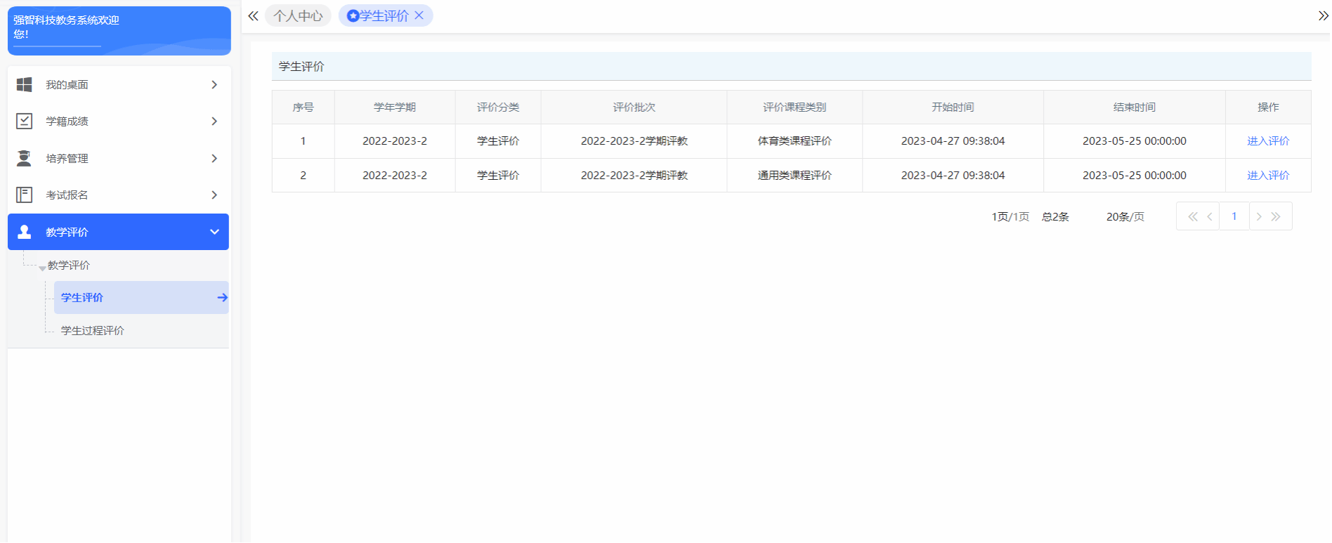 3、登录后可通过:1、上方快捷访问:学生评价;2、左侧操作栏:【教学评价】-【学生评价】进入当前学期评教页面。