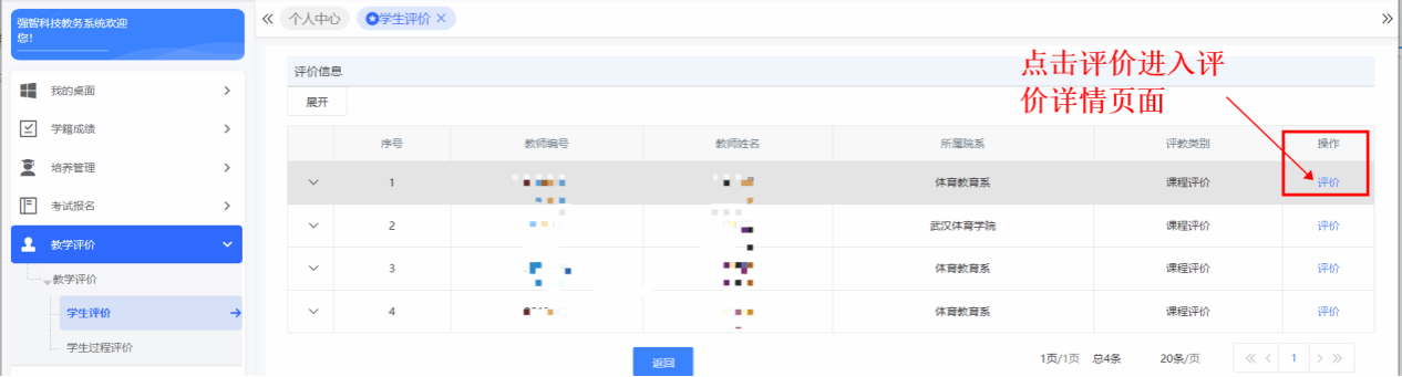 4.根据各项评教指标逐一进行评价,确保对所有老师的全部课程都进行评价,避免漏评;提交前认真核实每门课程评教信息,评教结果一旦提交,将不能再更改;